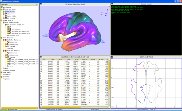 Modelling and visualization of neuroscientific data. A further interest of mine is to develop an open-source, extensible, Java-based environment to both model and visualize brain structure and function. This environment will include database functionality, including connections to CoCoMac and other publicly available neuroscientific datasets. The development of this tool is intended to provide a number of capabilities, including flexible static and dynamic modelling at various scales, and visualization of structures, connectivity, and model output. An online interface allowing visualization of various types of neuroscientific data, registered to a template model, is also in development. New: the planned release date for the beta version of what I am tentatively calling the modelGUI project is 30 June, 2010. A pre-release version is now available; see the new Wiki site for details. |