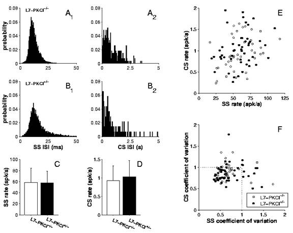 We investigated the discharge of Purkinje cells in alert adult L7-PKCI mice as well as their multiple climbing fiber innervation beyond the age of 3 months. We found that the simple spike and complex spike firing properties such as mean firing rate, interspike interval and spike count variability, oscillations, and climbing fiber pause in the L7-PKCI mutants were indistinguishable from those in their wild type littermates. In addition, we found that multiple climbing fiber innervation does not occur in cerebellar slices obtained from 3-6 months old mutants. These data indicate 1) that neither PKC inhibition nor the subsequent blockage of LTD induction disturbs the spontaneous discharge of Purkinje cells in alert mice; 2) that Purkinje cell specific inhibition of PKC detains rather than prevents the developmental conversion from multiple to mono-innervation of Purkinje cells by climbing fibers; and 3) that as a consequence the impaired motor learning as observed in older adult L7-PKCI mutants cannot be due to either a disturbance in the baseline simple spike and complex spike activities of their Purkinje cells nor to a persistent multiple climbing fiber innervation. We conclude that cerebellar LTD is probably one of the major mechanisms underlying motor learning, but that deficits in LTD induction and motor learning as observed in the L7-PKCI mutants may only be reflected in differences of the Purkinje cell signals during and/or directly after training.