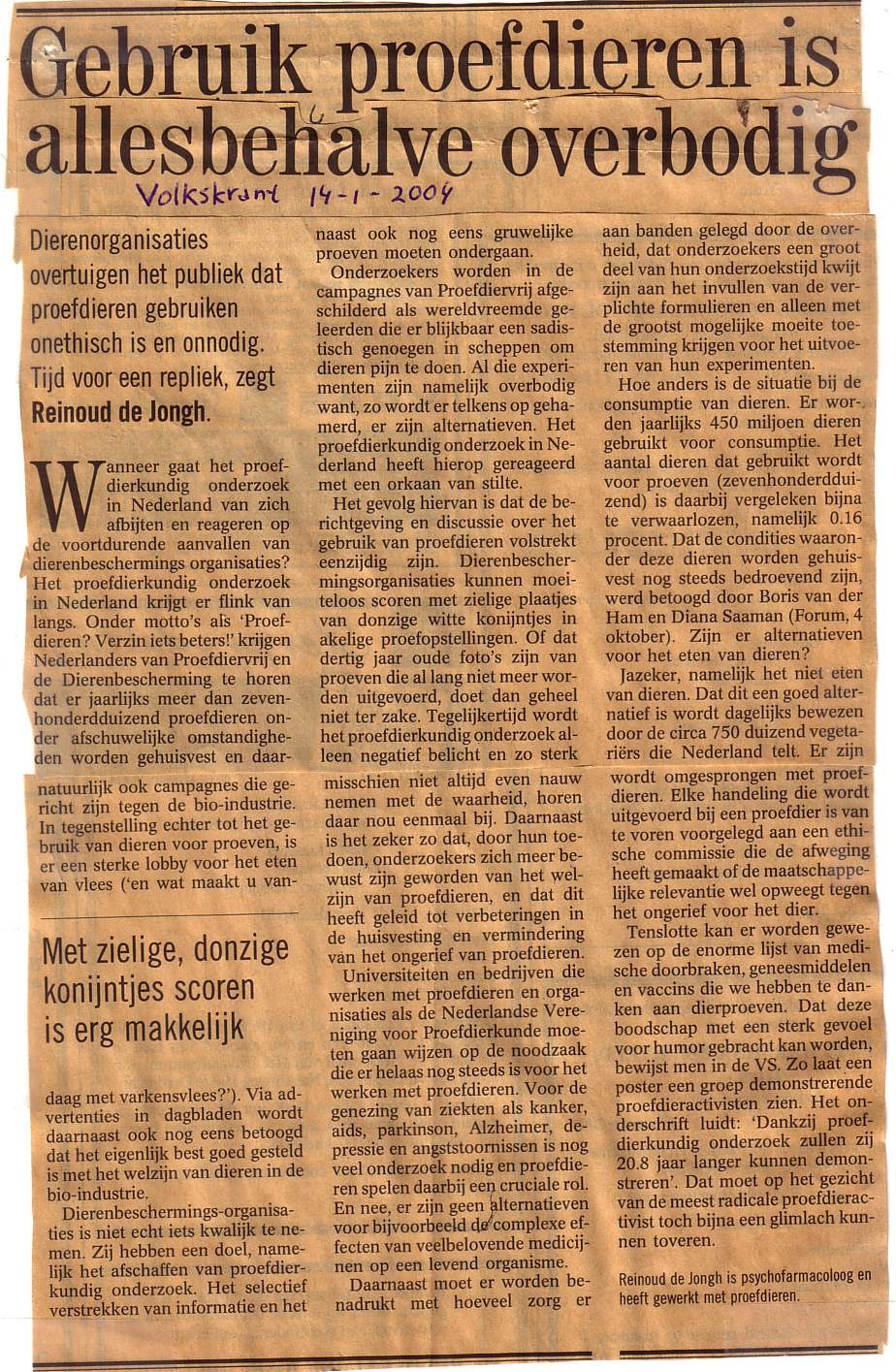 | Proefdieren zijn onmisbaar voor de Biomedische wetenschap (zie bijv. deze poster). Dat werd al in 2004 overtuigend betoogd in de Volkskrant, maar wordt steeds maar weer opnieuw door Radicale Dieractivisten (RDA's) ontkend, met steeds maar weer hetzelfde mantra, tot op de dag van vandaag...... | |
