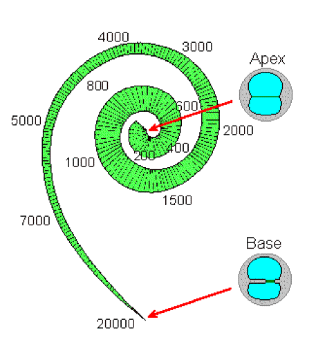 | Tonotopie van het Basilair Membraan: de getallen geven de geluidsfrekwenties