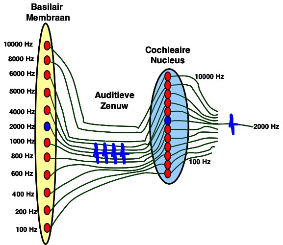 verwerkingsstation. De tonotopische ordening blijft hierbij in het gehele auditieve