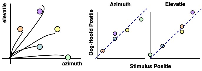 De linkerfiguur toont de gemeten oogbewegingen naar een vijftal verschillende stimulusposities