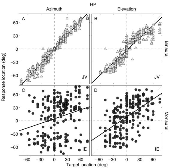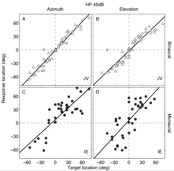 ![]() | Hoofdbewegingsresponsies zijn nauwkeurig voor zowel de azimuth als de elevatie componenten voor beide proefpersonen (al lijkt de eenzijdig dove meer spreiding te vertonen). Een dergelijke bevinding is ook in eerdere studies gerapporteerd (zij het met andere methoden), en leidde daar tot de conclusie dat eenzijdig doven klaarblijkelijk hebben geleerd om met één oor de benodigde geluidscues voor volledige localisatie te vergaren. |